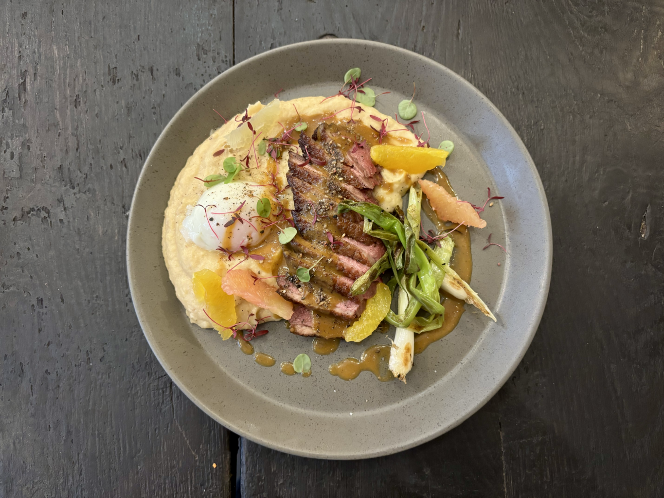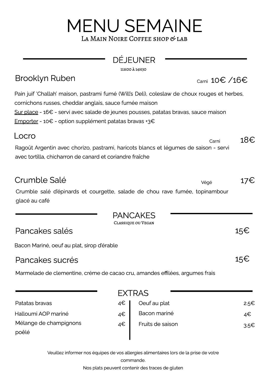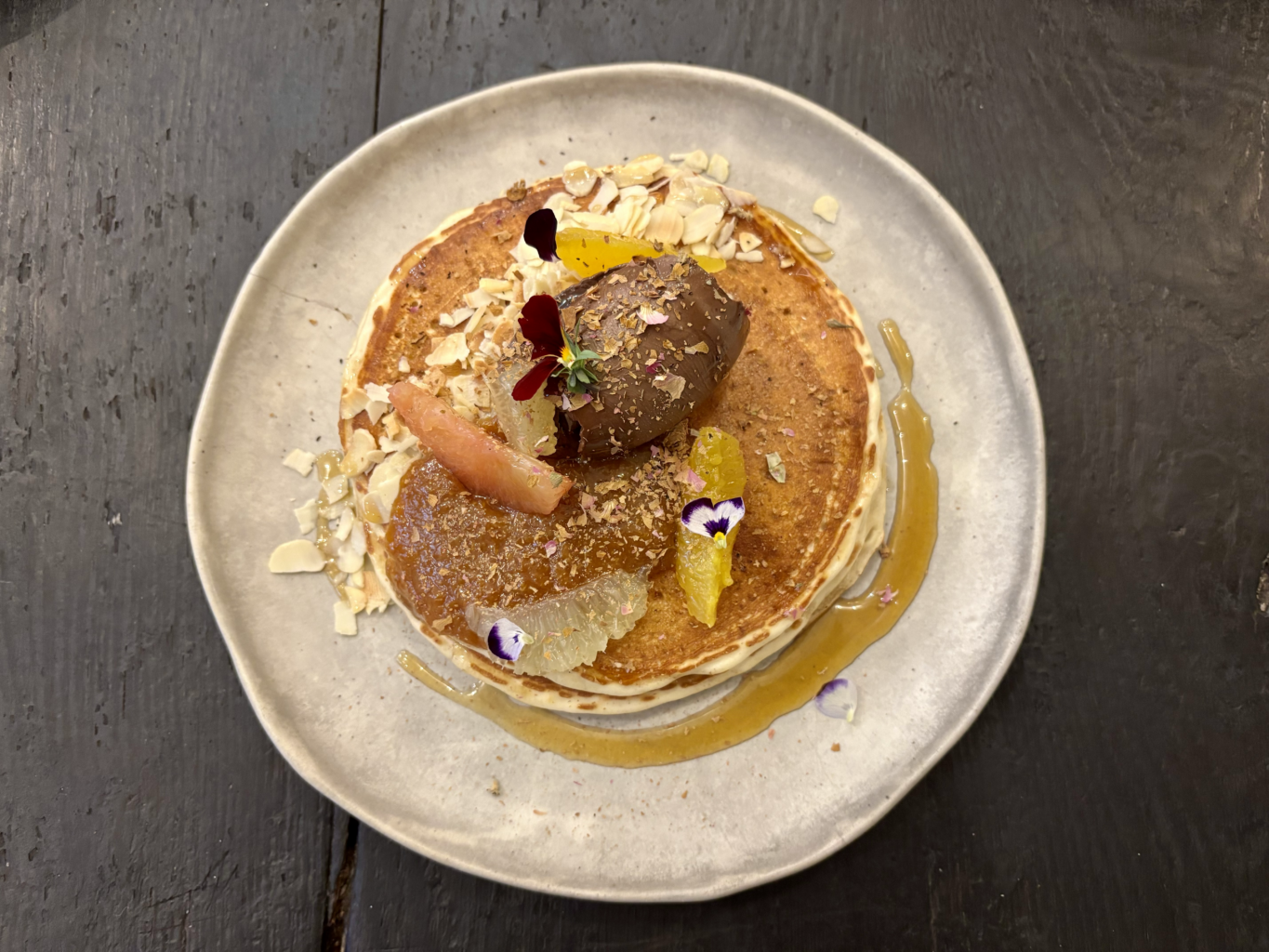 Pancakes Sucrés – Marmelade de clementine, créme de cacao cru, amandes effilés, supremes d’agrumes