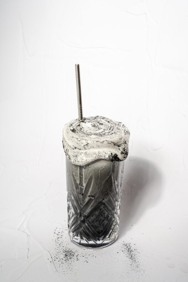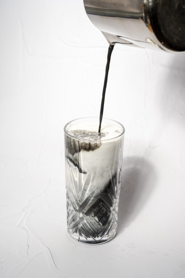 Le hojicha, avec ses notes torréfiées et subtilement noisettées, s’accorde naturellement avec la finesse du cacao cru. Tous deux apportent une sensation de rondeur et de réconfort en bouche. Le charbon végétal actif, au goût neutre, intensifie la profondeur visuelle tout en enrichissant la recette par ses propriétés purifiantes.