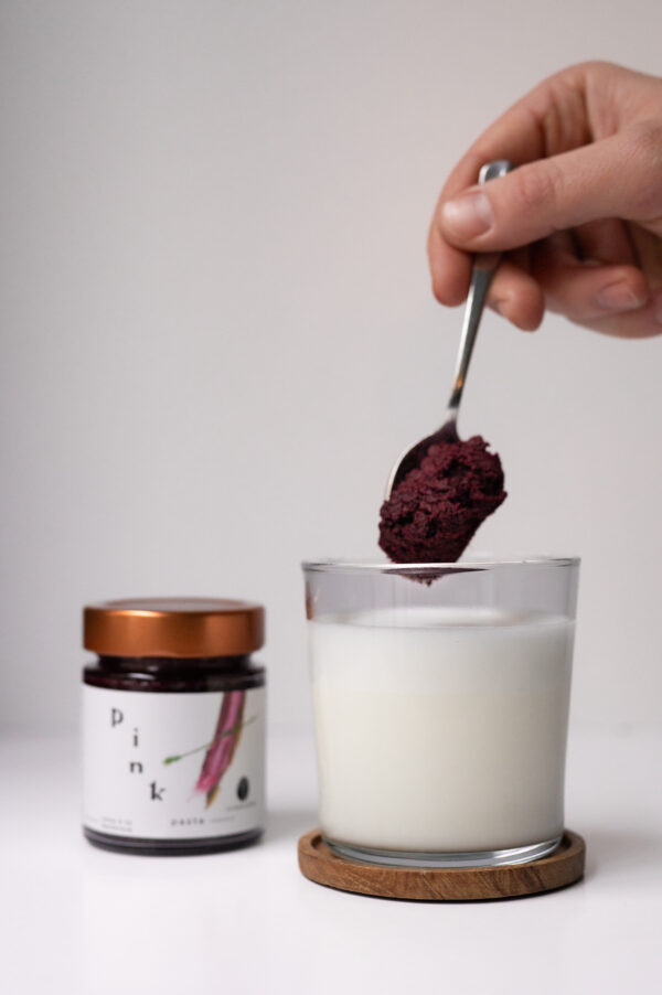 La Pink Paste associe betterave confite, cacao cru et cardamome verte dans une préparation 100 % naturelle.