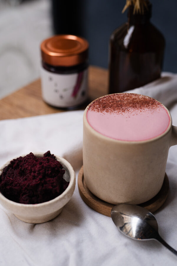 Polyvalente, la Pink Paste s’utilise aussi bien en latte qu’en cuisine pour des créations colorées et gourmandes. Naturellement riche en nutriments, elle réunit les bienfaits de la betterave et du cacao cru, appréciés pour soutenir la circulation et contribuer à une bonne santé cardiovasculaire.
